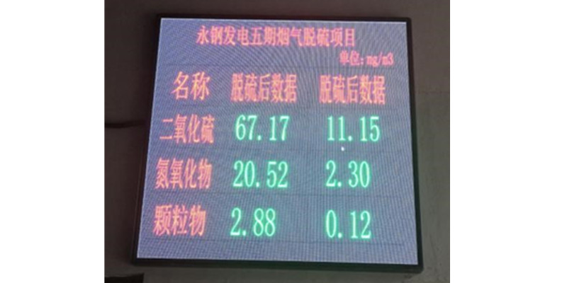 公司EPC總承包的聯(lián)峰鋼鐵有限公司電力廠5#煙氣脫硫項目自投運以來,通過對鍋爐煙氣脫硫前后參數(shù)的采集與對比,對脫硫劑小蘇打的噴吹量實現(xiàn)自動調節(jié),經(jīng)過一個月的調試,除塵器出口煙氣含塵顆粒物、SO2,氮氧化物的含量均低于國家超低排放行業(yè)標準,達到公司承諾運行保證值,滿足性能考核要求。脫硫后的排放數(shù)據(jù)實時顯示到大屏,對外公布。
