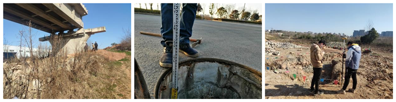 本次現(xiàn)場實(shí)測數(shù)據(jù)包含現(xiàn)狀鐵路橋橋墩坐標(biāo)、橋梁凈空,已建設(shè)道路交叉口坐標(biāo)及高程,已施工雨、污水井坐標(biāo)及井深等,測量項(xiàng)目涉及到“陽邏之心”50多萬平方米二十余條道路,測量范圍廣闊,測量目標(biāo)眾多,而測量人員僅為王學(xué)皓、吳修業(yè)及二十冶測量技術(shù)員陳工,實(shí)測任務(wù)異常艱巨?,F(xiàn)場多為半施工或未施工道路,測量情況十分復(fù)雜,并同時遭遇武漢強(qiáng)降溫天氣,踏勘工作面臨極大考驗(yàn)。尤其在雨污水井?dāng)?shù)據(jù)測量方面,部分道路車流量較大,需搭設(shè)臨時圍擋保證測量安全;部分重型井蓋受重載車輛碾壓密實(shí)變形,現(xiàn)有工具簡陋,僅打開井蓋這一項(xiàng)往往需要數(shù)十分鐘,完成單個井?dāng)?shù)據(jù)測量至少需要一個多小時,遠(yuǎn)遠(yuǎn)超出預(yù)估時間。與時間節(jié)點(diǎn)競速,測量人員踏霜踩露而出,披星戴月而歸,歷經(jīng)四天全力以赴、克難攻堅(jiān),圓滿完成所有測量任務(wù),為設(shè)計(jì)工作順利進(jìn)行提供了有力的數(shù)據(jù)支持。