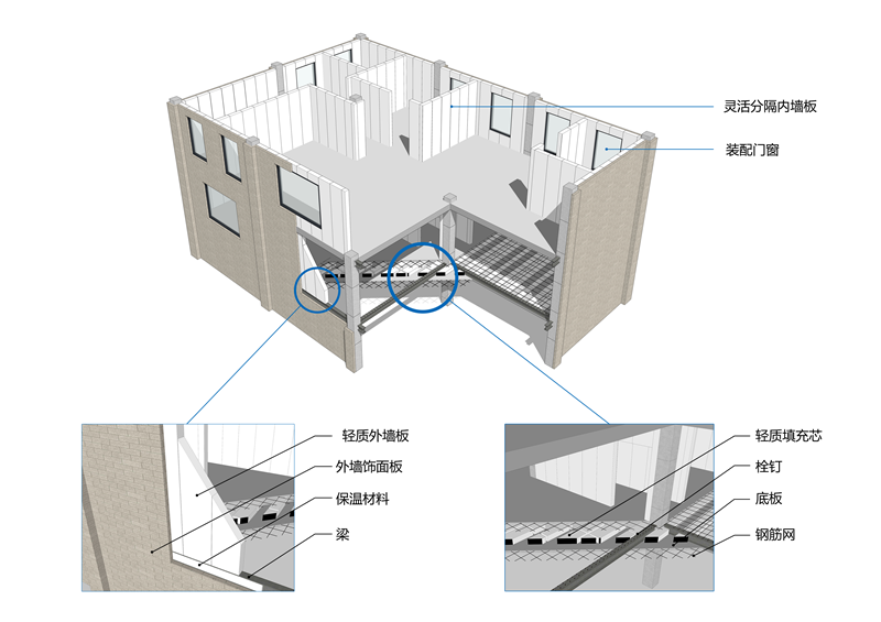 隱梁裝配式鋼結(jié)構(gòu)建筑集成體系:以建筑功能為核心,以結(jié)構(gòu)布置為基礎(chǔ),以工業(yè)化的圍護(hù)、內(nèi)裝和設(shè)備管線部件為支撐,綜合考慮建筑布局、外立面、結(jié)構(gòu)體系、圍護(hù)結(jié)構(gòu)、設(shè)備管線、構(gòu)件防護(hù)、內(nèi)裝等各方面的協(xié)同與集成,實(shí)現(xiàn)了主體鋼結(jié)構(gòu)系統(tǒng)、外圍護(hù)系統(tǒng)、設(shè)備管線系統(tǒng)、內(nèi)裝系統(tǒng)協(xié)同,將鋼梁隱藏于樓板或墻體內(nèi),避免鋼結(jié)構(gòu)外露對(duì)使用功能的影響,解決了鋼結(jié)構(gòu)防腐、防火問題,同時(shí)還發(fā)揮出了裝配式鋼結(jié)構(gòu)建筑在大空間靈活分隔方面的優(yōu)勢(shì)。